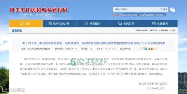 2022年06月16日,包头市住房和城乡建设局发布《关于推动我市绿色建筑、装配式建筑、被动式超低能耗建筑健康发展的相关优惠政策》,公开征求社会各界意见。截止日期为2022年7月1日。以下为政策全文: