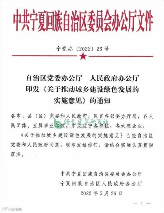 2022年5月26日,宁夏自治区委办公厅、区政府办公厅印发《关于推动城乡建设绿色发展的实施意见》。