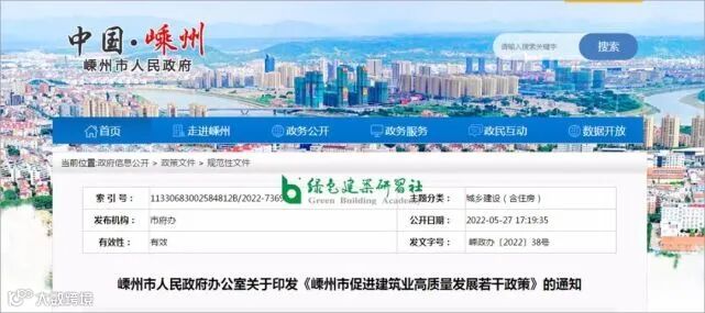2022年5月18日,嵊州市人民政府办公室发布《嵊州市促进建筑业高质量发展若干政策》。