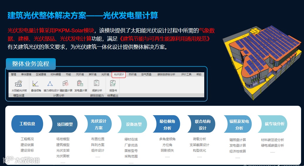 光伏发电量计算采用PKPM-Solar模块,模块提供了太阳能光伏设计过程中所需的气象数据、建模、光伏部品、光伏发电计算功能,满足《建筑节能与可再生能源利用通用规范》有关建筑光伏的条文要求,为光伏建筑一体化设计提供整体解决方案。