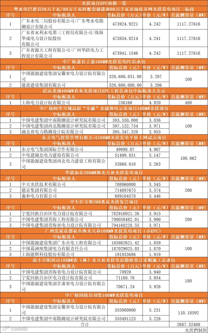 近日,粤水电、华能、中广核、中车、广州发展等超2.7GW项目EPC公示了中标候选人。根据光伏們查询共10个项目,项目包括农光互补、林光互补、光储热电示范项目、渔光互补等多种类型,EPC也包含大EPC和小EPC。其中规模最大的是粤水电巴楚县20万千瓦/80万千瓦时配套储能和80万千瓦市场化并网光伏发电项目二标段,直流侧规模1117.27616MW。具体情况如下: