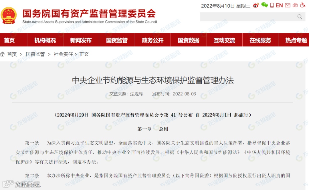 8月3日,国务院国有资产监督管理委员会在官网正式发布了《中央企业节约能源与生态环境保护监督管理办法》(以下简称《管理办法》),自2022年8月1日起施行。