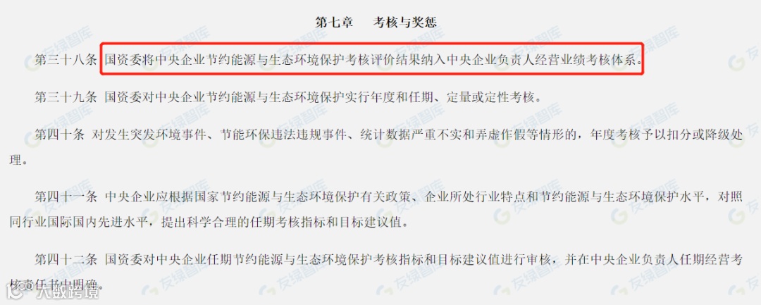 《管理办法》明确国资委将中央企业节约能源与生态环境保护考核评价结果纳入中央企业负责人经营业绩考核体系,落实碳达峰碳中和目标是重点工作之一。在2021年底,国资委曾印发《关于推进中央企业高质量发展做好碳达峰碳中和工作的指导意见》,《管理办法》的印发则将推动其落到实处。