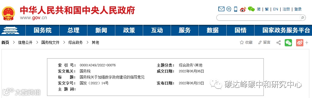 6月23日,国务院发布《关于加强数字政府建设的指导意见》。《意见》指出,推动绿色低碳转型。加快构建碳排放智能监测和动态核算体系,推动形成集约节约、循环高效、普惠共享的绿色低碳发展新格局,服务保障碳达峰、碳中和目标顺利实现。