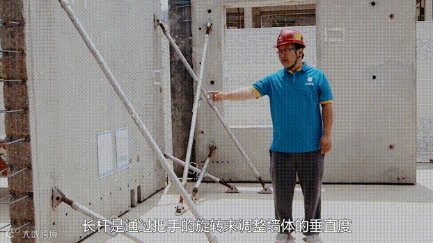 第四步,摘钩:入位后利用靠尺对预制墙体进行校核。