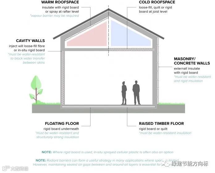 屋顶空间(冷阁楼):屋顶托梁水平的松散填充喷雾或纤维绝缘材料,尽管需要考虑屋顶空间的通风。