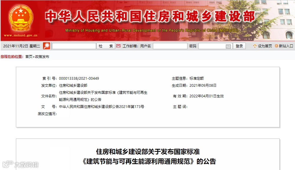 批准《建筑节能与可再生能源利用通用规范》为国家标准,编号为GB 55015-2021,自2022年4月1日起实施。 -