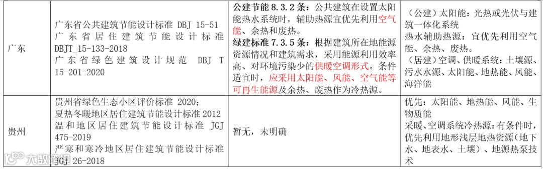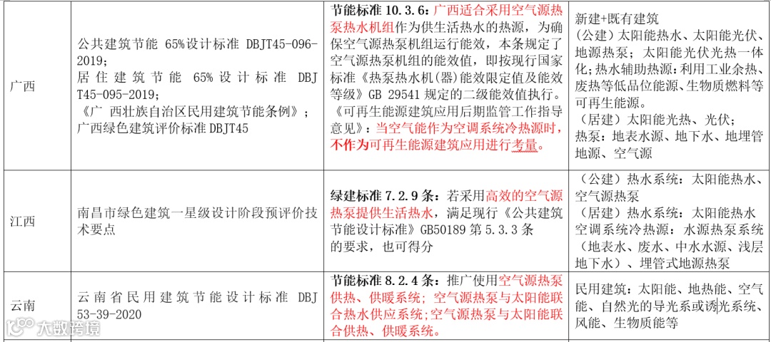 云南、广东广州、河源等城市均属于太阳能资源较富区,以上城市的太阳能保证率宜为 40%~50%。太阳能是间歇性能源,为了保障太阳能热水系统稳定可靠运行,应当设置辅助热源。辅助热源种类的选用应当根据当地资源、经济条件,宜优先利用空气能、余热、废热(如工业余热、废热,空调冷凝热)等低品位能源和空气能等。其中南方地区空气能多用于居建热水系统中的辅助可再生能源,一般空气源热泵系统如果作为空调采暖系统中的冷热源设置,不可作为可再生能源的利用范围,在绿建设计中往往也是不得分的,详见下表: