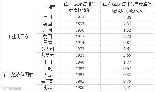 根据各个国家和地区工业化进程不同大致分为两个阵营,一个是工业化发达国家,以美国、英国、德国等为首,普遍在20世纪30年代率先到达碳排放强度峰值,且这些工业化发达国家碳排放强度普遍在一般在2~3kgCO₂/IntGK$之间。另一个是以中国、印度、巴西等为首的新兴经济体国家,普遍在20世纪90年代达到峰值,主要新兴经济体国家碳排放强度峰值都较小,一般在0.5~2kgCO₂/IntGK$之间。我国有两个峰值年,第一峰值年为1960年、第二峰值年为1978年。