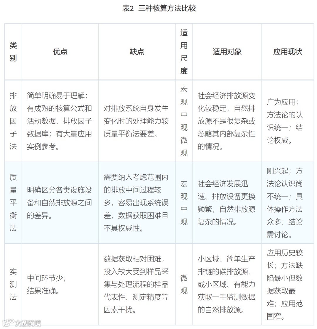 目前,使用范围较广,兼具宏观微观特点的碳排放核算方法有三种:排放因子法、