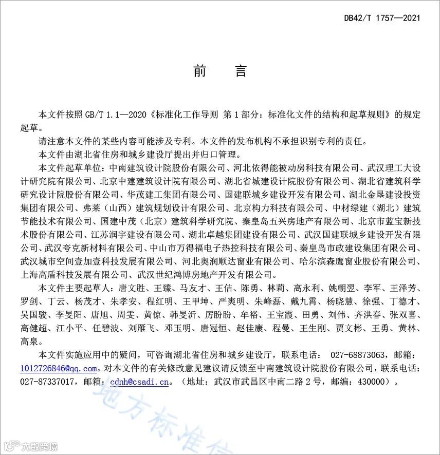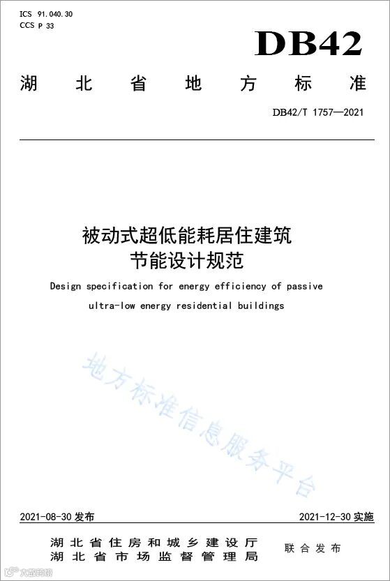 2021年8月30日,湖北省住房和城乡建设厅、湖北省市场监督管理局联合发布湖北省地方标准《被动式超低能耗居住建筑节能设计规范》(DB42/T 1757-2021)。