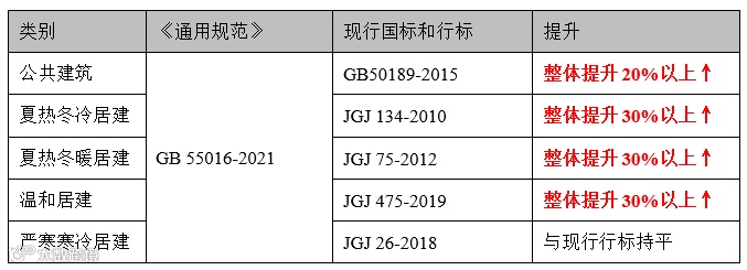 《通用规范》提高了居住建筑、公共建筑的热工性能限值要求,与大部分地区现行节能标准不同,平均设计能耗水平在现行节能设计国家标准和行业标准的基础上分别降低 30%和 20%。