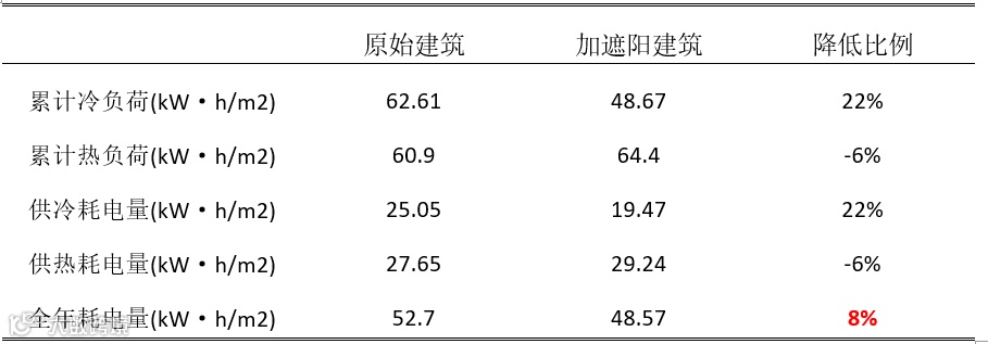 对该栋建筑添加铝合金活动外遮阳后,调整后的遮阳系数冬季可达0.5,夏季可达0.25,最终全年耗电量的降低比例可以达到8%,甚至接近绿建二星级负荷降低比例的要求。