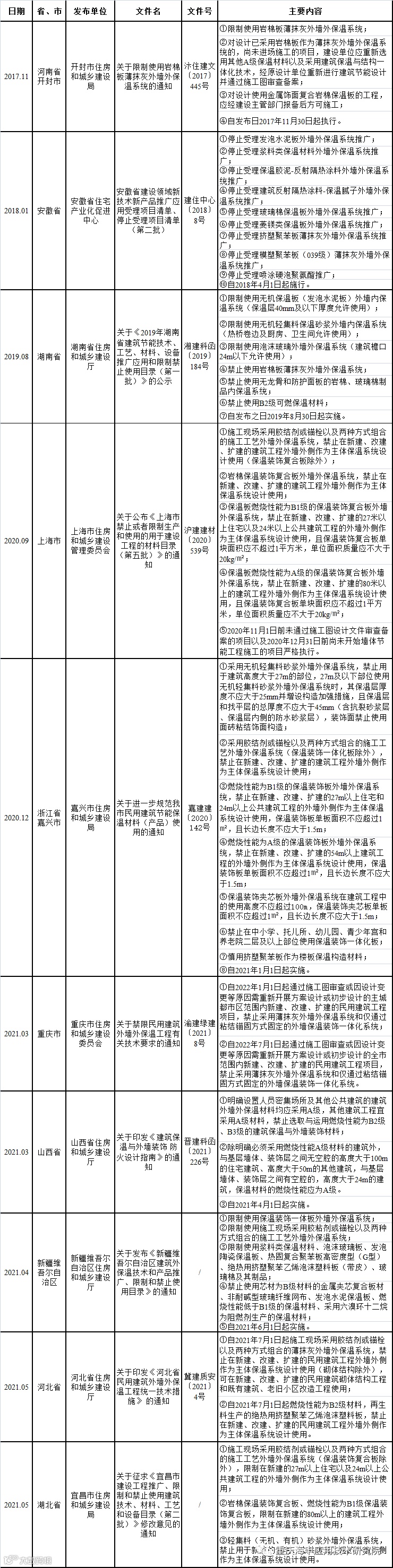 各省市关于“禁限外墙外保温系统技术”规定汇总