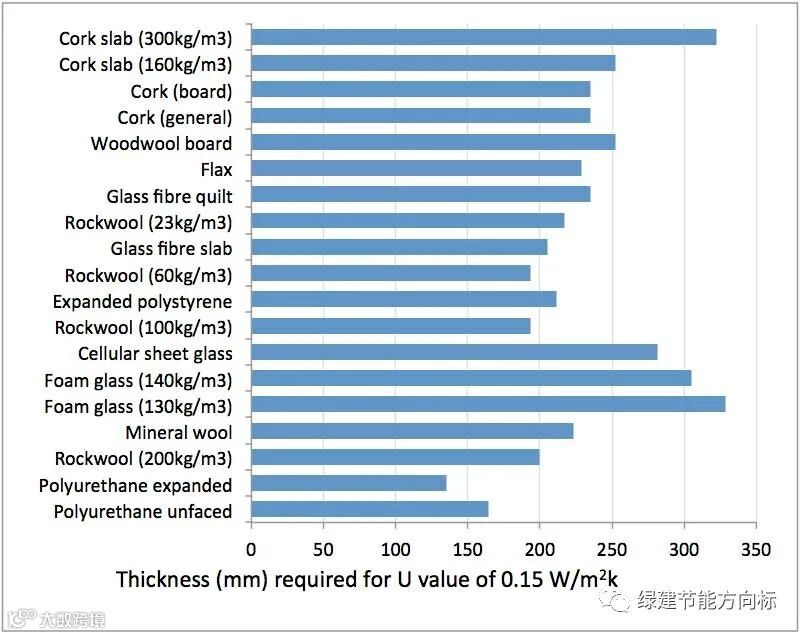 因为不同的保温材料导热系数不一样,达到相同的保温效果下,厚度也会不一样。展示给大家的第一个图片,是达到0.15W/(m2.K)下,不同保温材料的厚度情况。这里假设了一种环境,即除了保温材料不一样,其他的基层构造都一样。