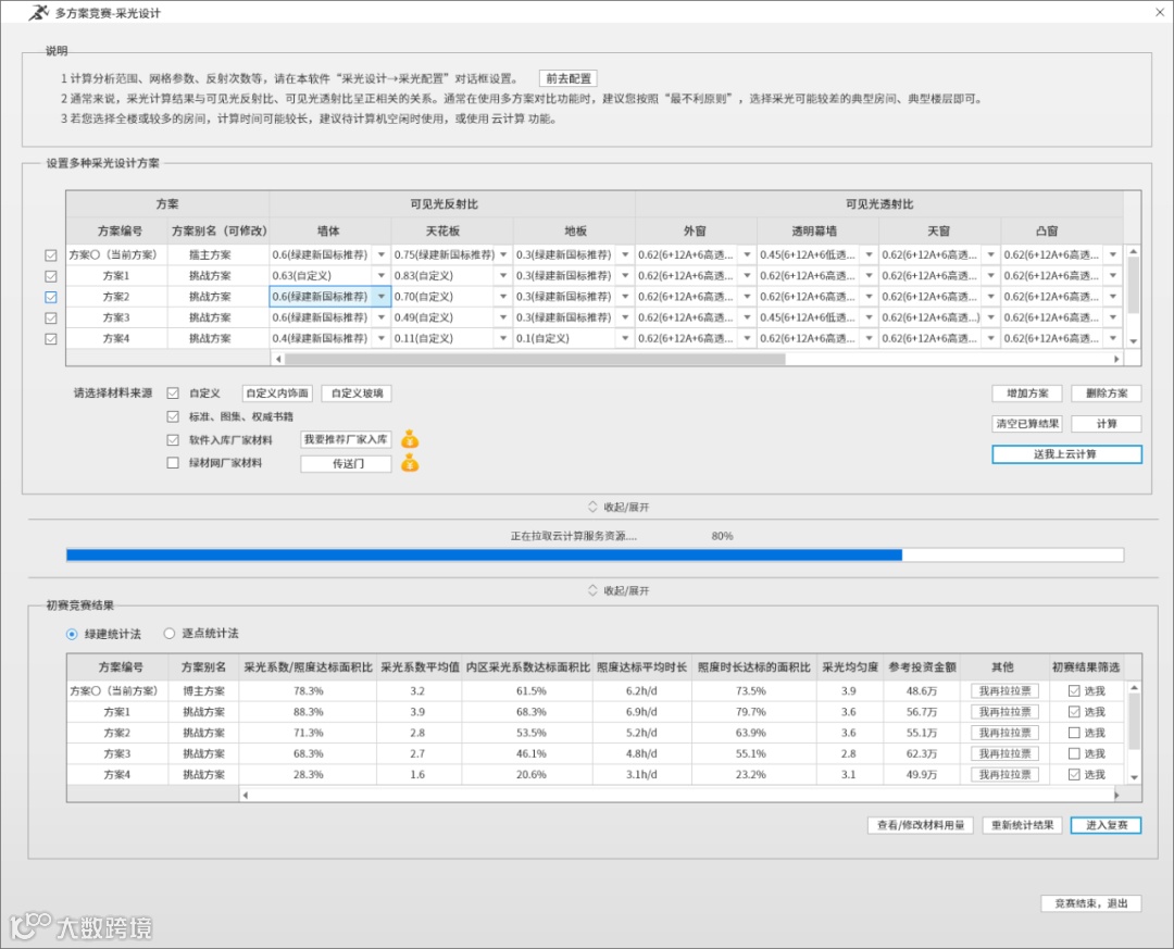 V3.2天然采光模拟软件新增多方案竞赛功能,对多个采光设置方案进行对比分析,用于采光优化和采光构件选型。现版本已支持多方案设置和计算分析,之后还将开放云计算等功能,方便采光多方案的快速计算和分析。