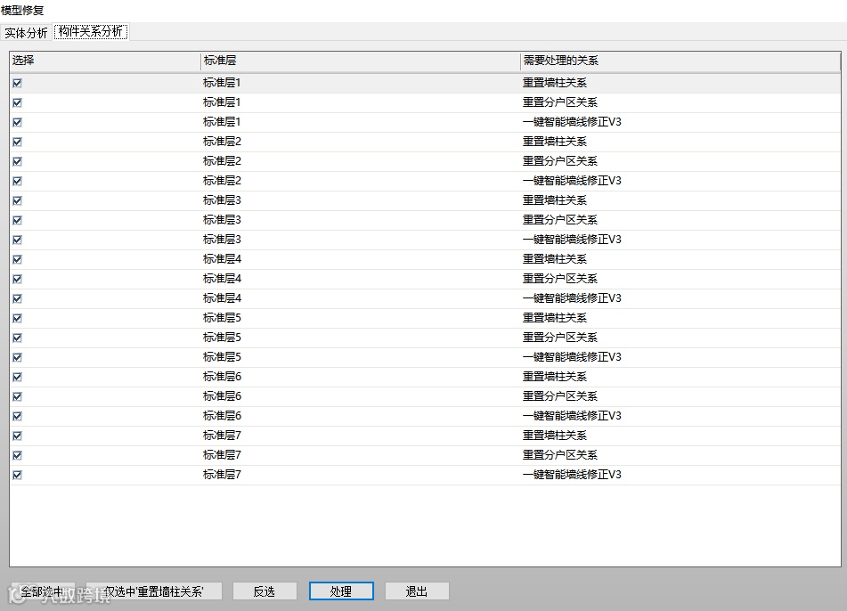模型修复功能包含重置墙柱关系、重置分户区关系、一键完成所有标准层修复,可同时对多个标准层进行多种模型修复工作,效率极高。