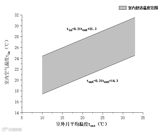 第1款以建筑物内主要功能房间或区域为对象,以全年建筑运行时间为评价时间范围,按主要功能房间或区域的面积加权计算满足适应性热舒适温度区间的时间百分比进行评分。建筑中人不是环境的被动接受者,而是能够进行自我调节的适应者,人们会通过改变着装、行为或逐步调整自己的反应以适应复杂的环境变化,从而接受较大范围的室内温度。而室内温度的舒适区间可以按下图所示确定: