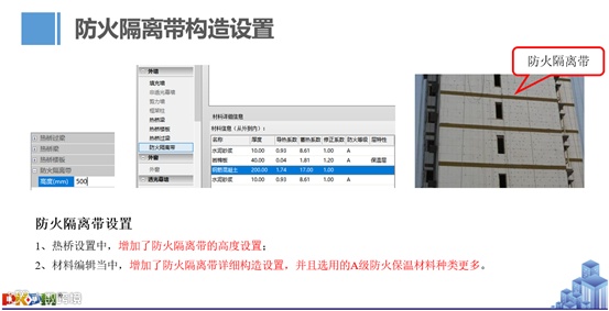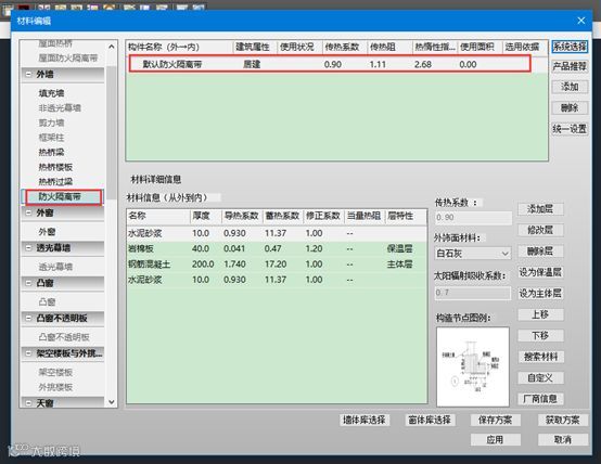 PKPM节能绿建软件V3.0平台新增设置防火隔离带功能。可在热桥设置功能中直接设置外墙、屋顶防火隔离带的高度;并且可在材料编辑——屋顶、外墙子类中直接设置防火隔离带的完整构造做法。