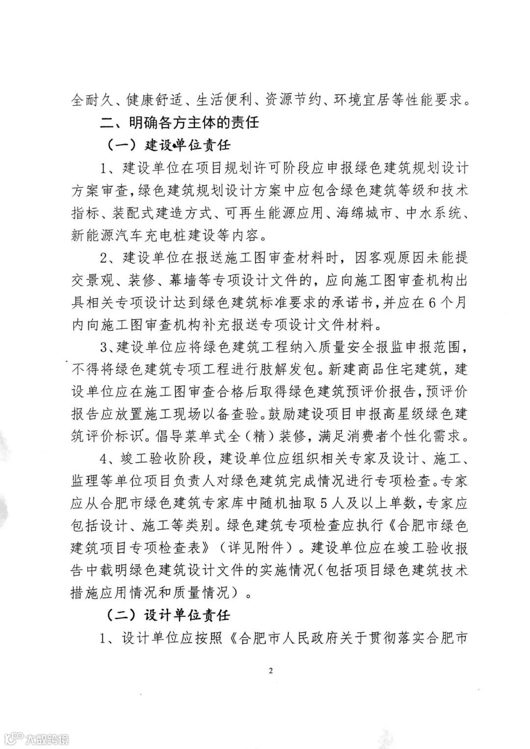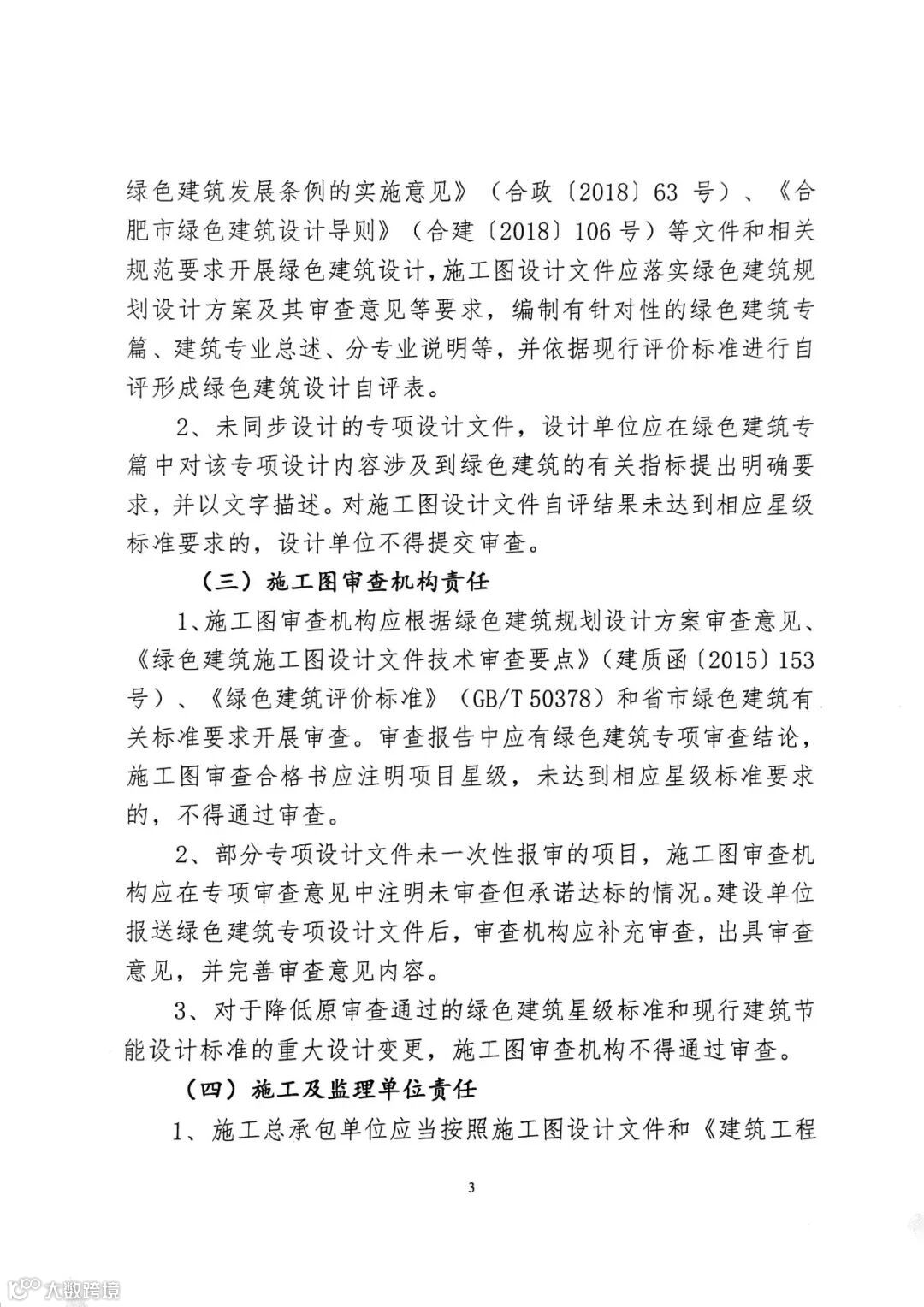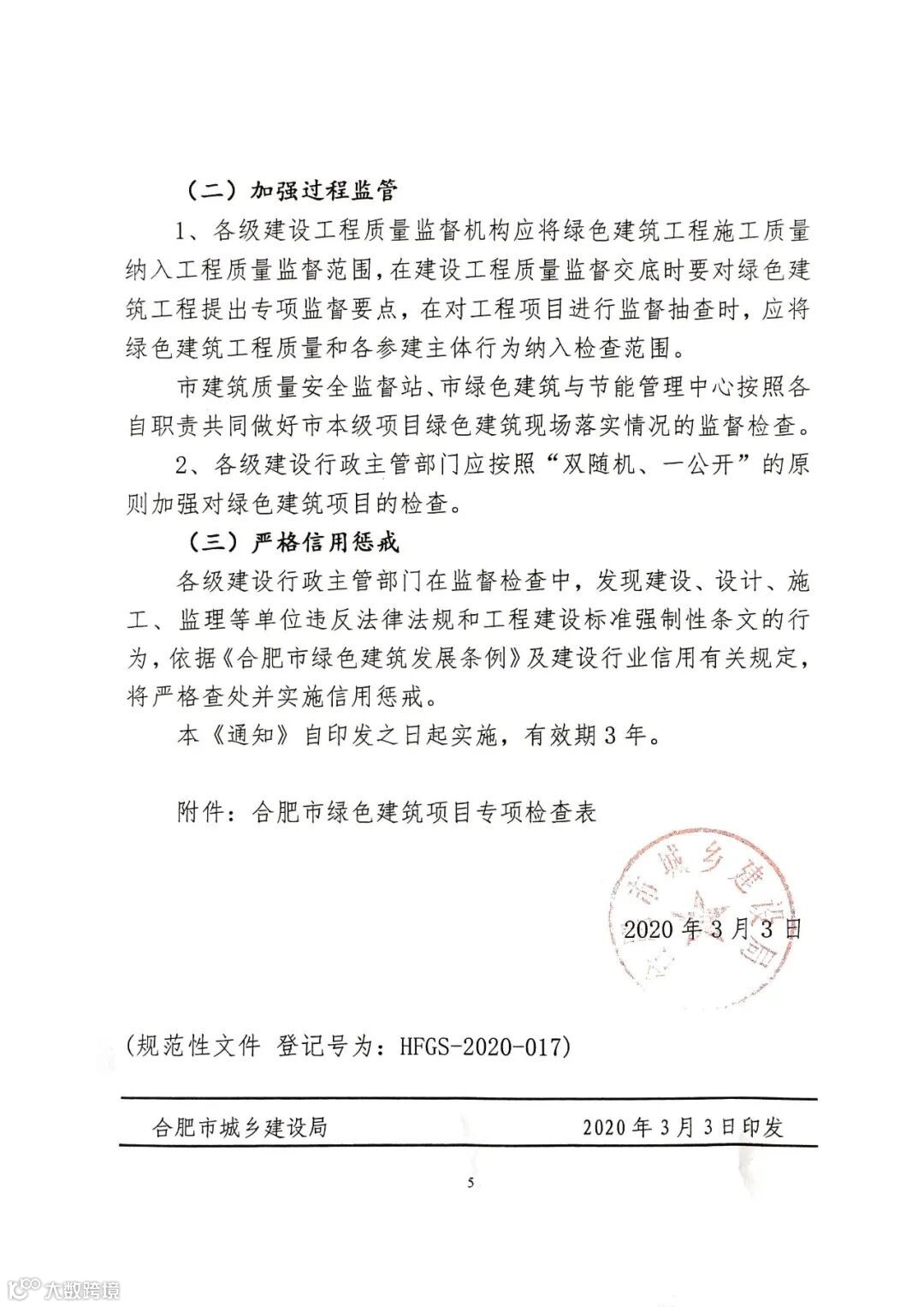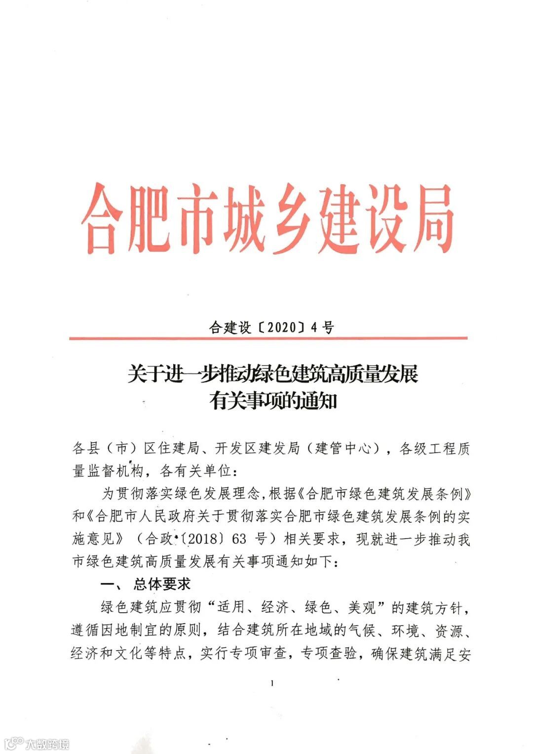 2020年3月4日,合肥市城乡建设局发布了《关于进一步推动绿色建筑高质量发展有关事项的通知》及政策解读。《通知》旨在进一步明确绿色建筑各方主体责任,加强绿色建筑监督管理,解决现在绿色建筑建设过程中存在的问题,促进合肥市绿色建筑高质量的发展。