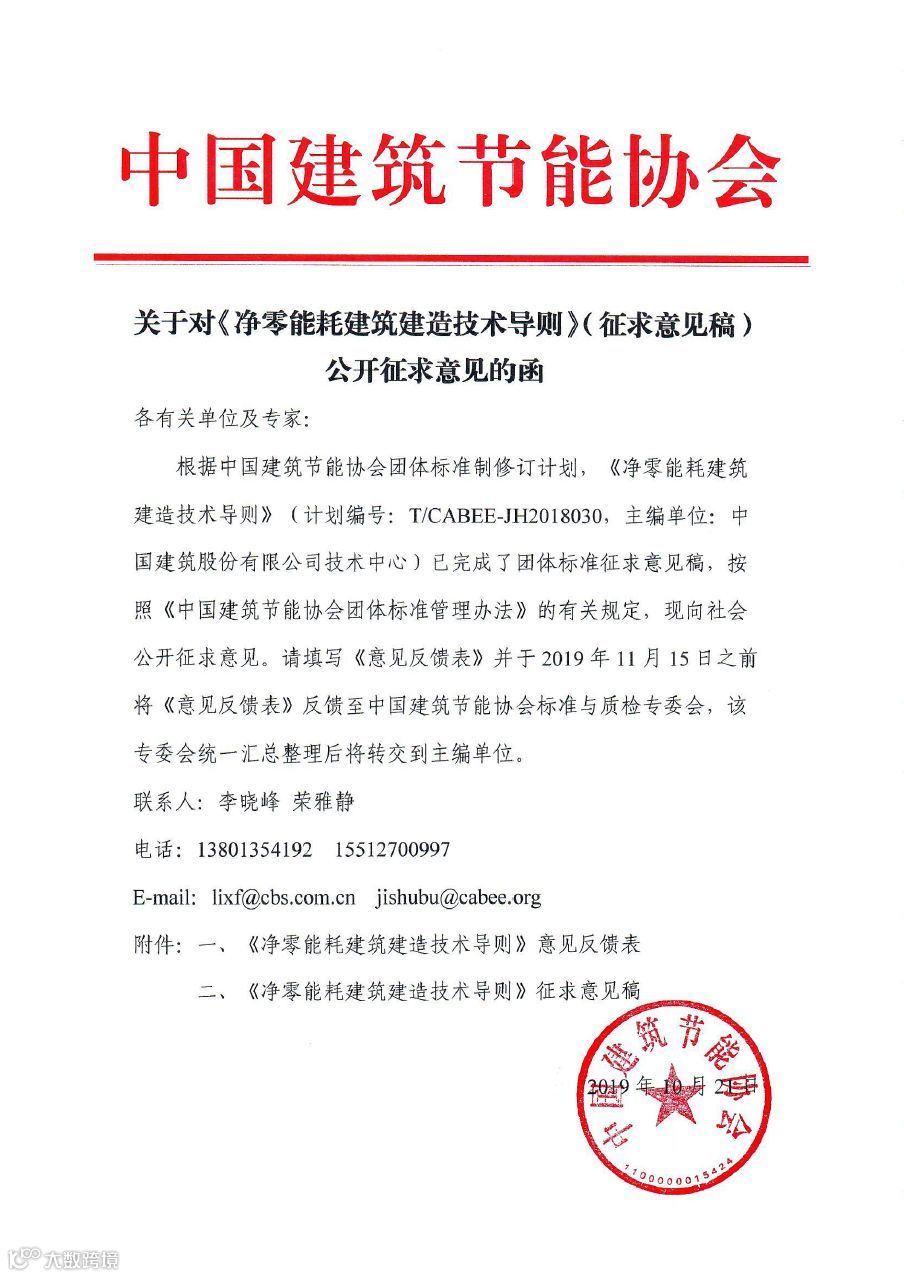 关于对《净零能耗建筑建造技术导则》(征求意见稿)公开征求意见的函