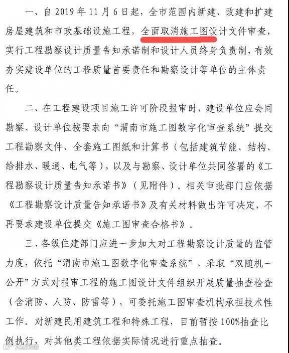 二、实施时间。2020年4月1日起取消施工图审查,实行告知承诺制,各项行政许可均不得以审查合格文件作为前置条件,但属于以下三种情况的项目按原施工图审查方式执行: