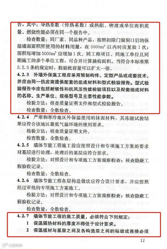 4.2.3:外墙外保温工程应采用预制构件、定型产品或成套技术,并应由同一供应商提供配套的组成材料和型式检验报告。型式检验报告中应包括耐候性和抗风压性能检验项目以及配套组成材料的名称、生产单位、规格型号及主要性能参数。
