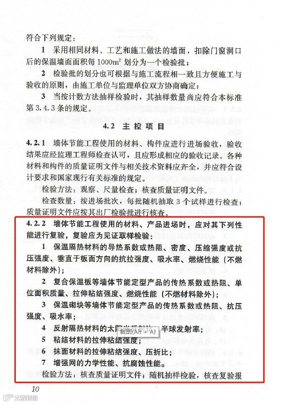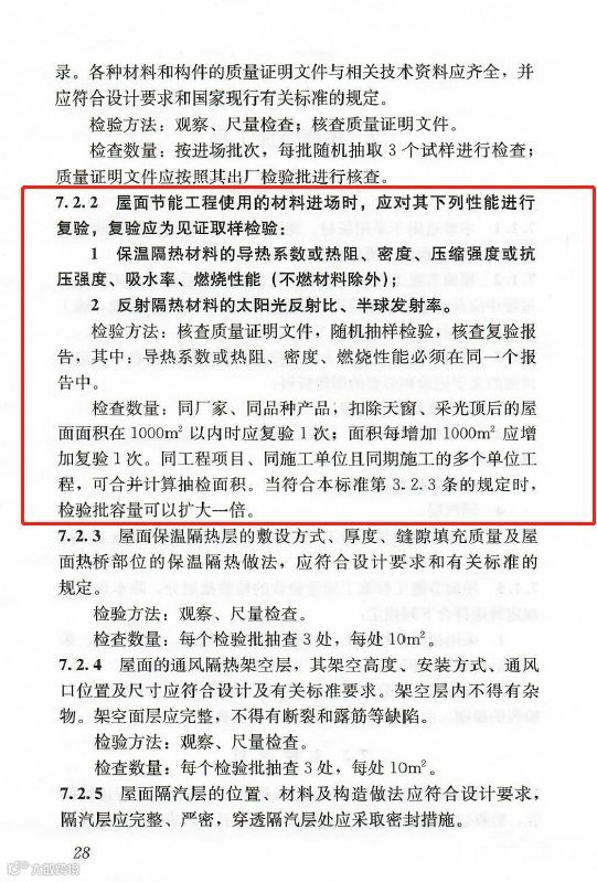 7.2.2:屋面节能工程使用的材料进场时,应对其下列性能进行复验,复验应为见证取样检验:1.保温隔热材料的导热系数或热阻、密度、压缩强度或抗压强度、吸水率、燃烧性能(不燃材料除外);2.反射隔热材料的太阳光反射比、半球发射率。