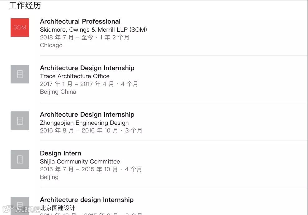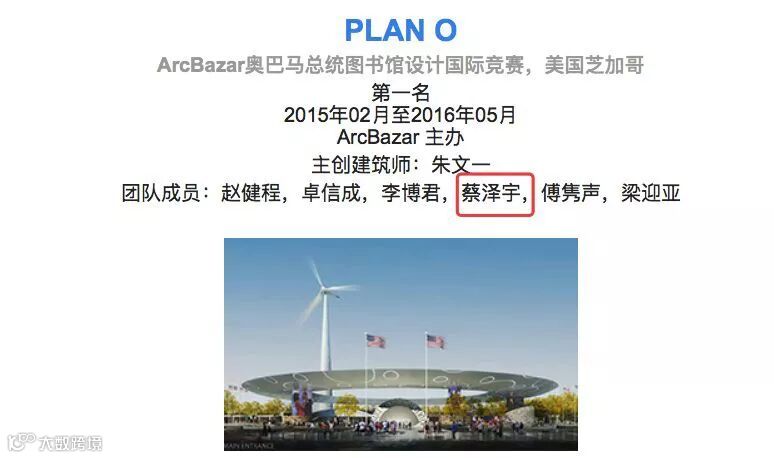 资料显示,SOM 建筑设计事务所(Skidmore, Owings and Merrill)成立于 1936 年,是世界顶级设计事务所之一。蔡泽宇在清华大学的导师是朱文一教授。朱文一工作室的作品多次在国际上获奖,其中,蔡泽宇参与的作品 PLAN O 获得 ArcBazar 奥巴马总统图书馆设计国际竞赛第一名。