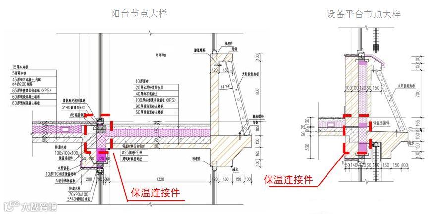 凸出建筑主体的阳台和设备平台是被动房明显的热桥薄弱环节,本方案采用保温连接件将挑板与主体进行连接,有效阻断阳台、设备平台等地方的热桥。传统的做法是将挑板四面包起来。