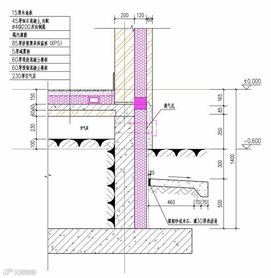 本方案采用架空地面,架空层内回填土比室外地坪高100㎜,能有效解决室内地坪积水问题,架空层外墙开设通气孔,保证空气层内自然通风,并且在保温层上面覆盖一层隔汽薄膜作为水蒸气的阻隔层。