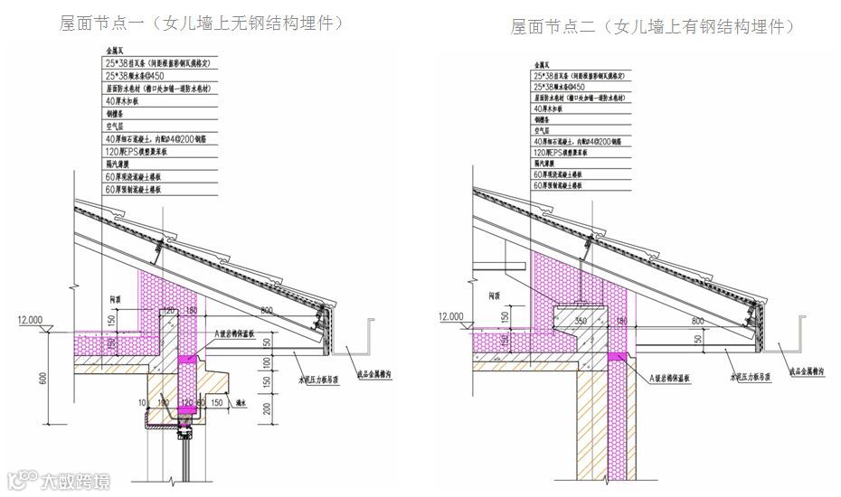 屋顶采用平屋顶+钢结构坡屋顶的方式,形成保温通风的空气间层;钢结构金属瓦屋面对平屋顶上面的保温层进行保护,提高了系统的耐候性。