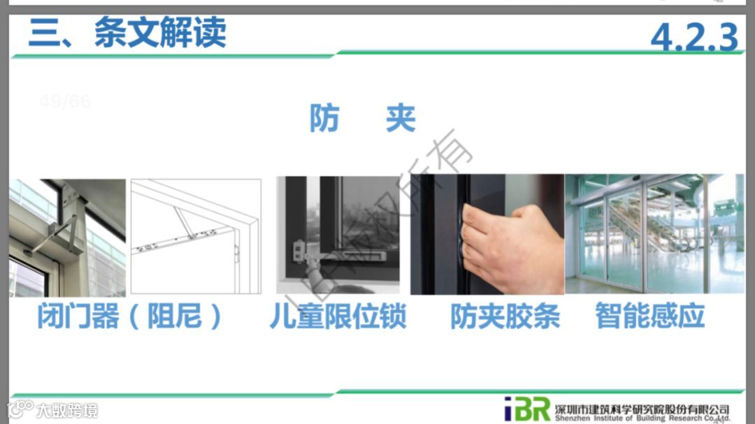 4.2.3(评分项)--安全防护产品、配件:本条主要是建议针对分隔件数室内外的玻璃门窗、幕墙等位置,一方面要做玻璃防撞措施,另一方面要使用安全玻璃;另外,针对人流大、门窗开合频繁的位置,采用可调节力度的闭门器或有缓冲功能的延时闭门器等措施,防止老人、小孩使用时夹伤;