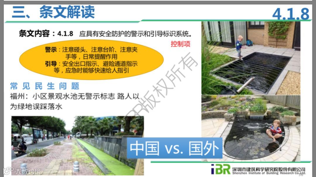 4.1.8(控制项)--警示与引导标识系统:本条要求针对可能有危险的位置给出警示和引导,如提醒注意碰头、注意夹手的提示牌,避险通道的路标指引,更重要的是提倡设计师从设计的角度,采用既提高安全性,又能保证美观的设计措施,如在小区的景观水池上铺设艺术网,防止小孩儿误踩跌落,又能保证景观的亲水性、美观性;