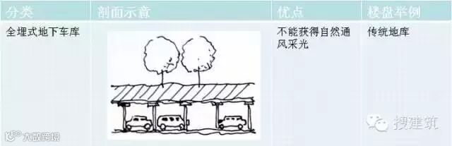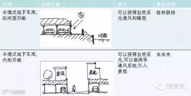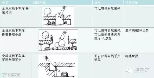 1. 按照地下车库与地面的关系,可以分为全埋式和半埋式两种,巧妙的剖面设计可以使地下车库获得自然采光与通风, 节能的同时创造了舒适的地下行车环境。