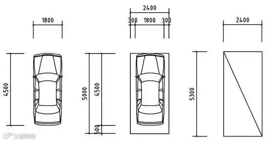 根据汽车库建筑设计规范所规定的车与车、墙、柱之间的净距(右图),计算出标准车位的设计尺寸应为5300(长)×2400(宽)。