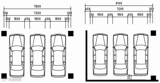 根据规范,停3辆车的柱间净宽应为7200,若采用600×600的柱子,停3辆车的柱网轴线间宽度至少为7800,若一边有墙则为8100。