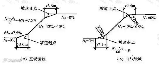 汽车库内当通车道纵向坡度大于10%时,坡道上、下端均应设缓坡。其直线缓坡段的水平长度不应小于3.6m,缓坡坡度应为坡道坡度的1/2。曲线缓坡段的水平长度不应小于2.4m,曲线的半径不应小于20m,缓坡段的中点为坡道原起点或止点。