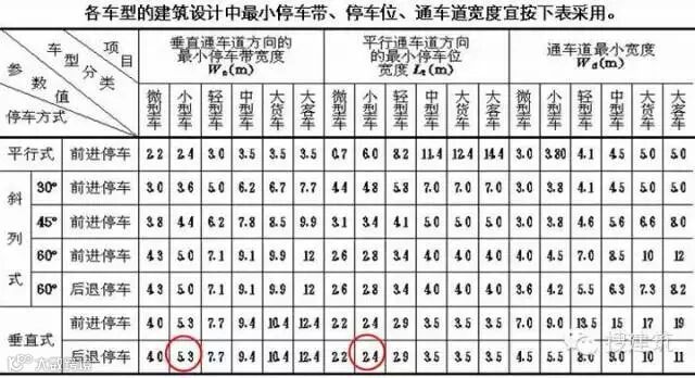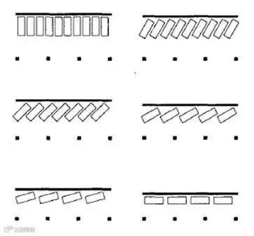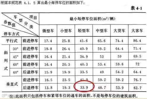 《汽车库建筑设计规范》中计算出的每车位面积,垂直后退停车所需的车道宽度最小,单车位面积最省(轻型车为33.9平米),为提高停车效率,原则上都应采用垂直后退停车。
