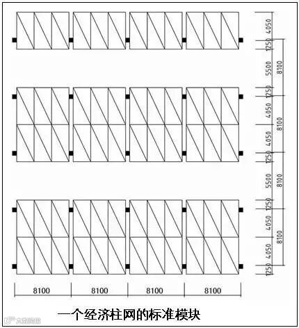 柱距每小100, 面积要差1.6平米, 以两个柱网放辆车来分析, 3辆车要半个柱网的面积因此每差100宽,对每辆车至少要差0.5平米的面积.因此尽量不要随意增加经济柱网的尺寸。