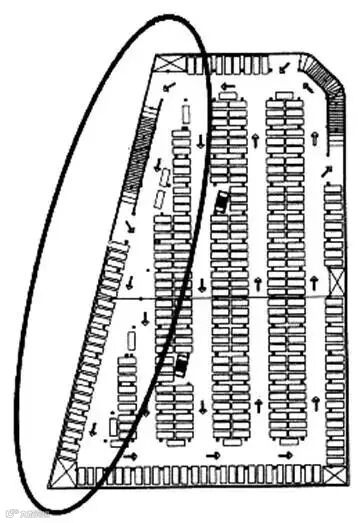 6.遇到地形有斜向的时候, 往往结构布局先排列标准柱网, 最后遇到外圈墙, 这样外圈主车道就很别扭。如果用另一个办法设计柱网, 即使外墙内的最后一排柱子平行于外墙, 就可以提高行车效率,且保证外圈主路的通畅。