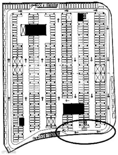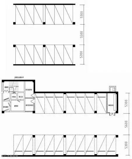 5.一些不够垂直停车的部位可适当布置斜角停车和直线停车,只要保持距后墙0.5m, 车车间距0.6m, 出车的前面有5.5m, 都能放车;