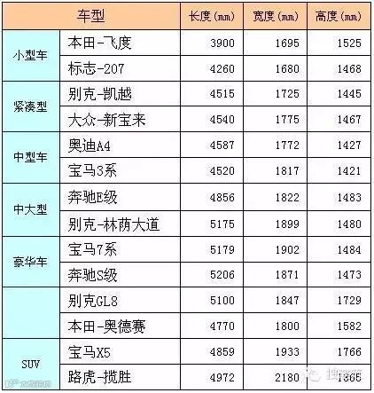 一般私家轿车的尺寸如下表: