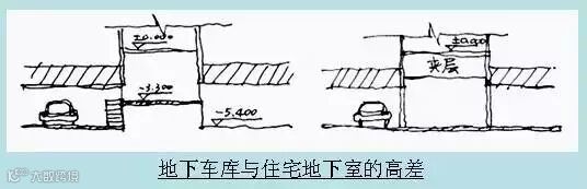 1.地下车库与住宅地下室由于覆土的原因,一般都有2米左右的高差;对于三类大地库和四类别墅地库, 为了实现品质感的追求,可以降低地下室地平与地库地平同标高, 以实现平进平出,代价是需要增加人防面积和土方挖深. 代表作品是绿城御园。
