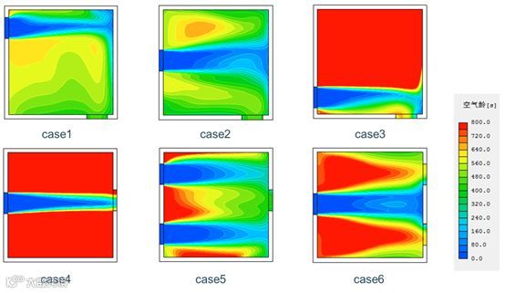 图2 6个case室内空气龄云图