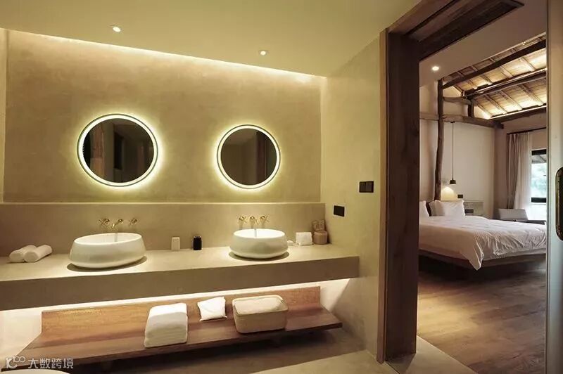 在内装材料的使用上也做到了极简,除了保留下来的原始木头屋架和柱子,房间的地台与家具也全部采用回收旧木,而地面和台盆则是干净的抛光水泥。