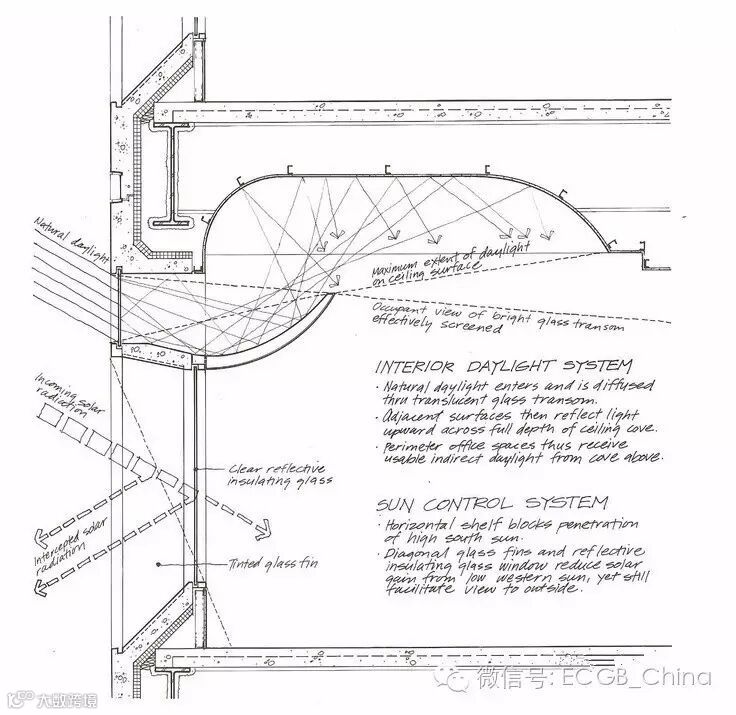 其实通过光滑或浅色材质来达到光学反射的目的,通常都是用在对昏暗感觉有较高要求或不好在立面上开常规窗,或当地的太阳实在太毒的情况下使用。下图够直白了: