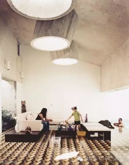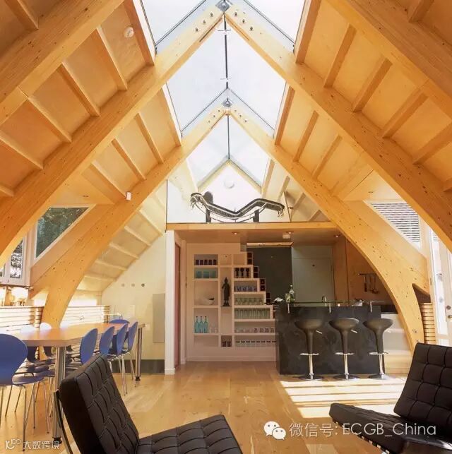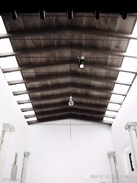 有时候一个洞开在屋顶会有点突兀,考虑将屋顶栅格横梁当做装饰,是不错的选择。