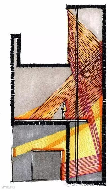 很多时候因为场地的信息所迫,我们不得不只采用立面开窗的方式,但迫于一些情况,有时候一旦开了窗,就会破坏原有的空间感。怎么破? 可以将采光桶进行变形,置入墙内,于是有了这样的设计: