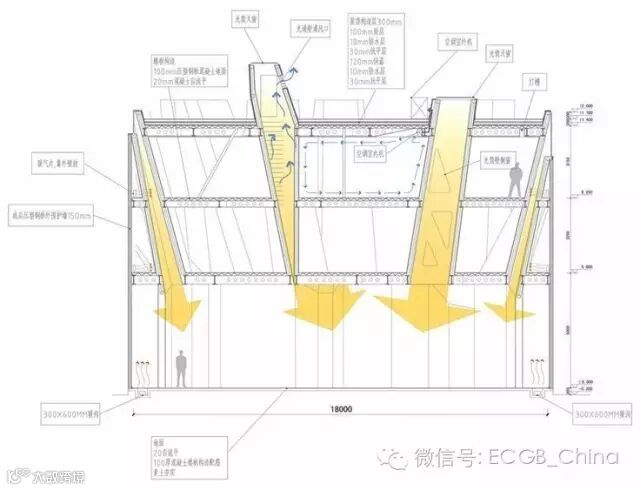 通过采光桶的置入,让光线从屋顶直通地下。下图是采光桶的细节示意图: